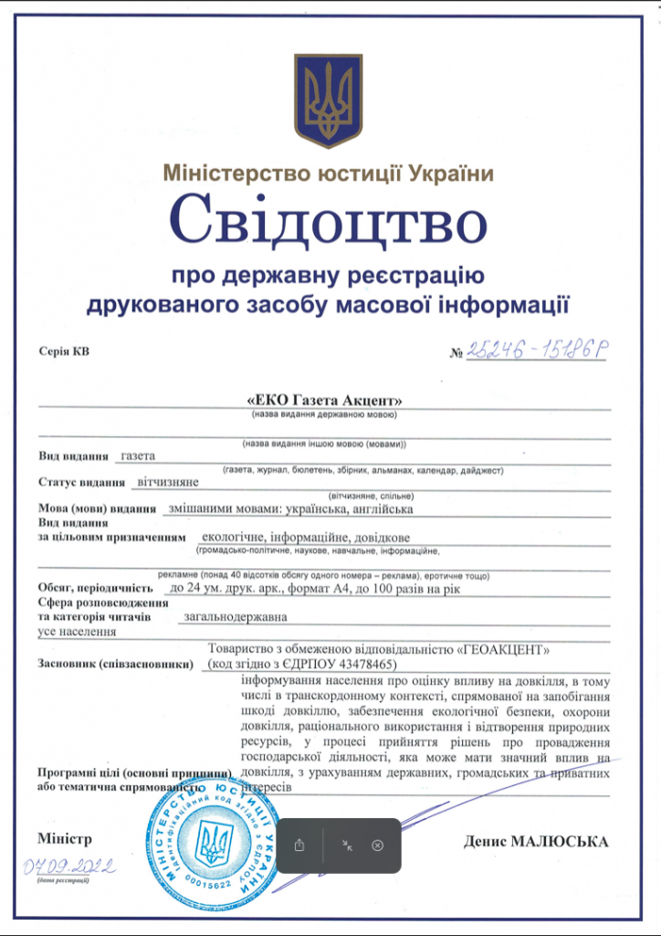 Свідоцтво про реєстрацію засобу масової інформації КВ 25246-15186Р від 7.09.2022 р.
