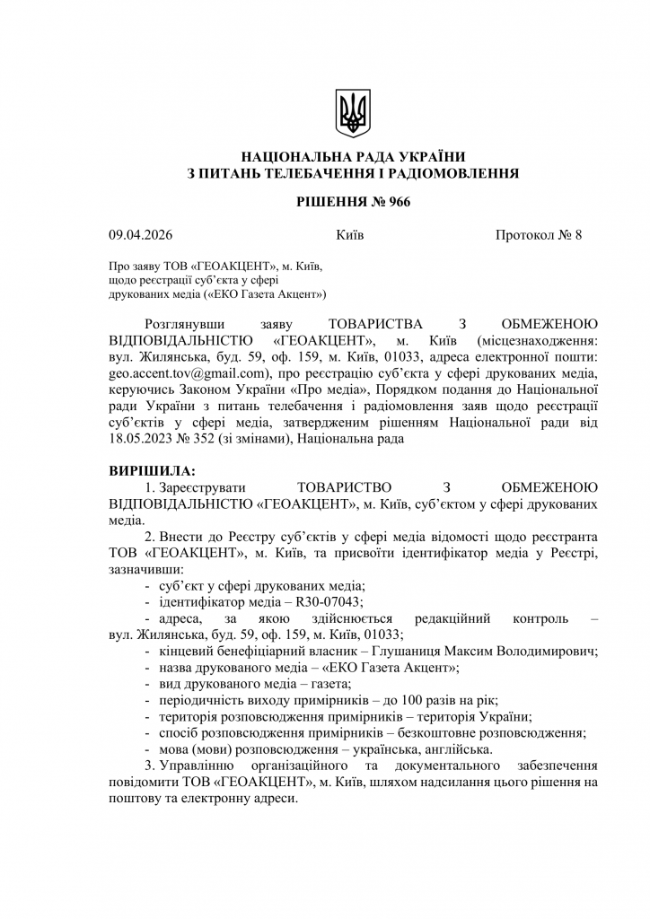 Ідентифікатор медіа – R30-07043 (рішення №966 від 09.04.2026 р.)